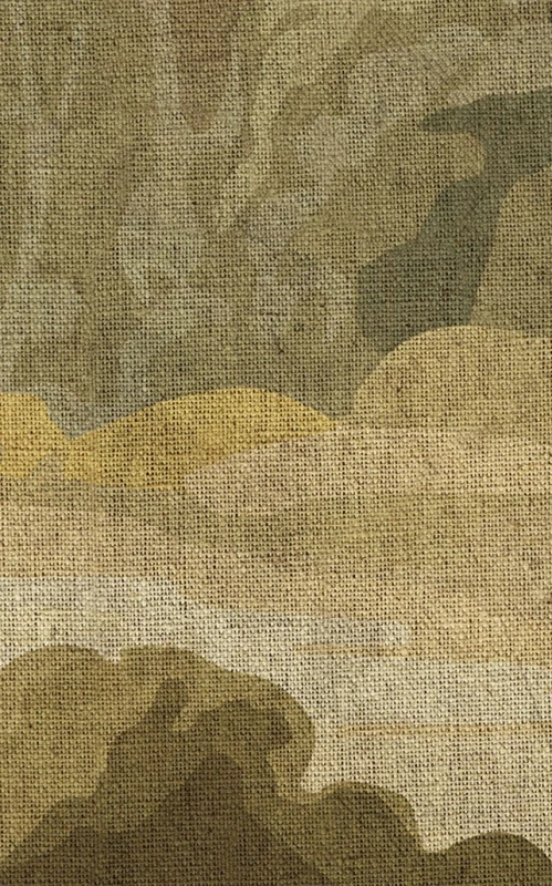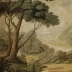An old landscape on linen reveals a melancholy scene of dense forest, in dark and earthy tones. A pastoral painting told in the style of an Aubusson tapestry.